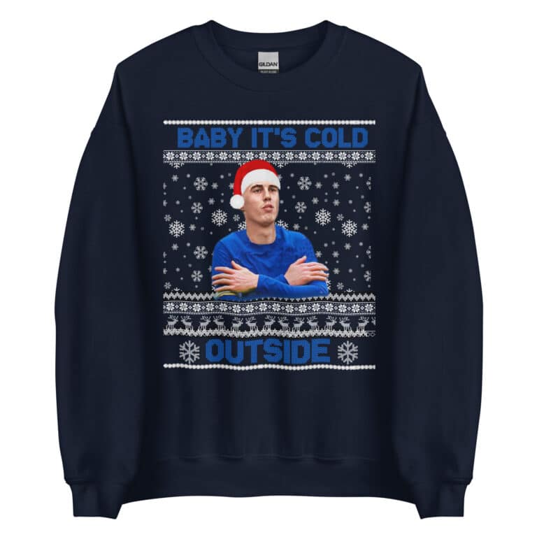 • Stylish Chelsea Blue Design: Paying homage to the Blues, this jumper features a classic Chelsea-inspired design. With the phrase “Baby, It’s Cold Outside” adding a playful twist, it’s perfect for both holiday festivities and match days.