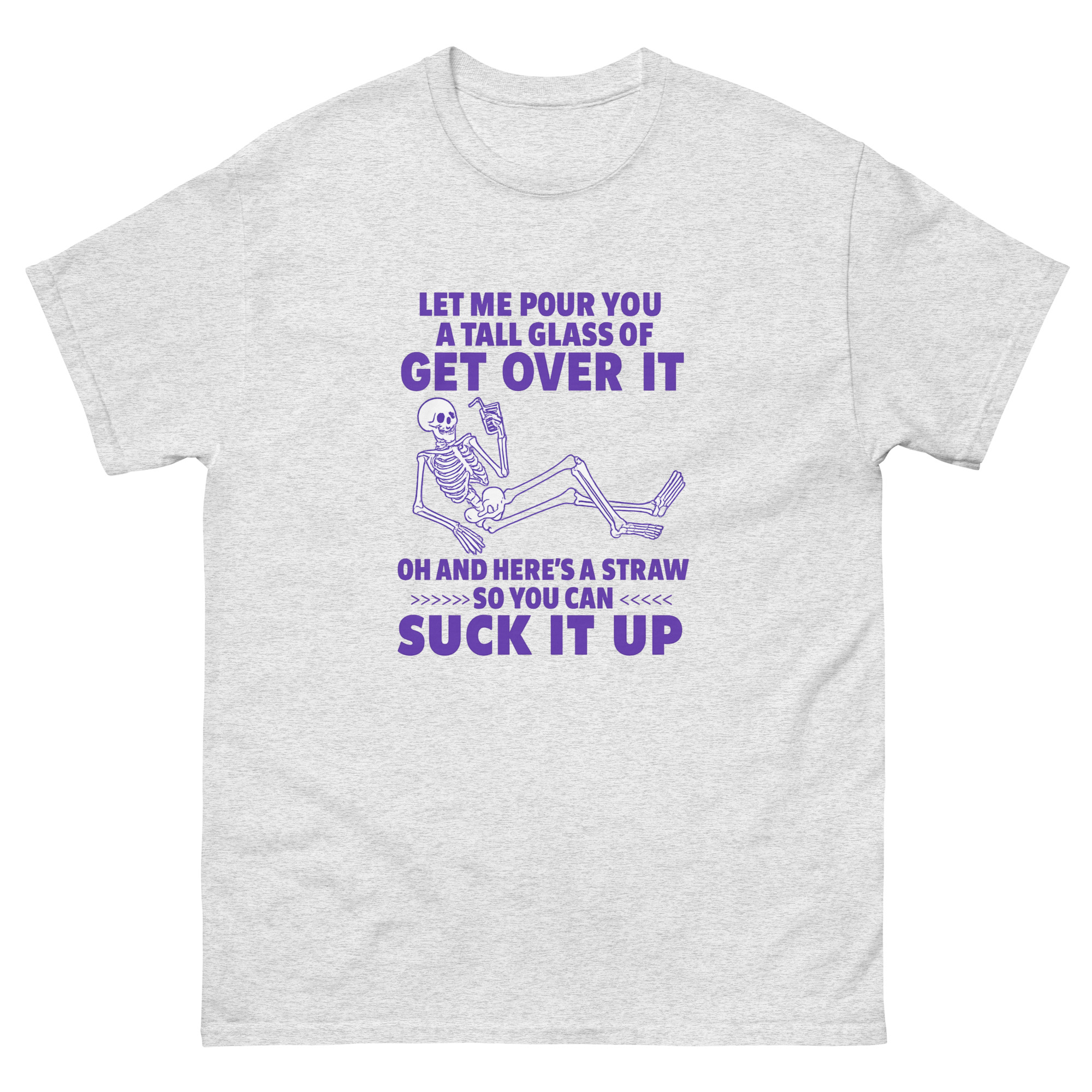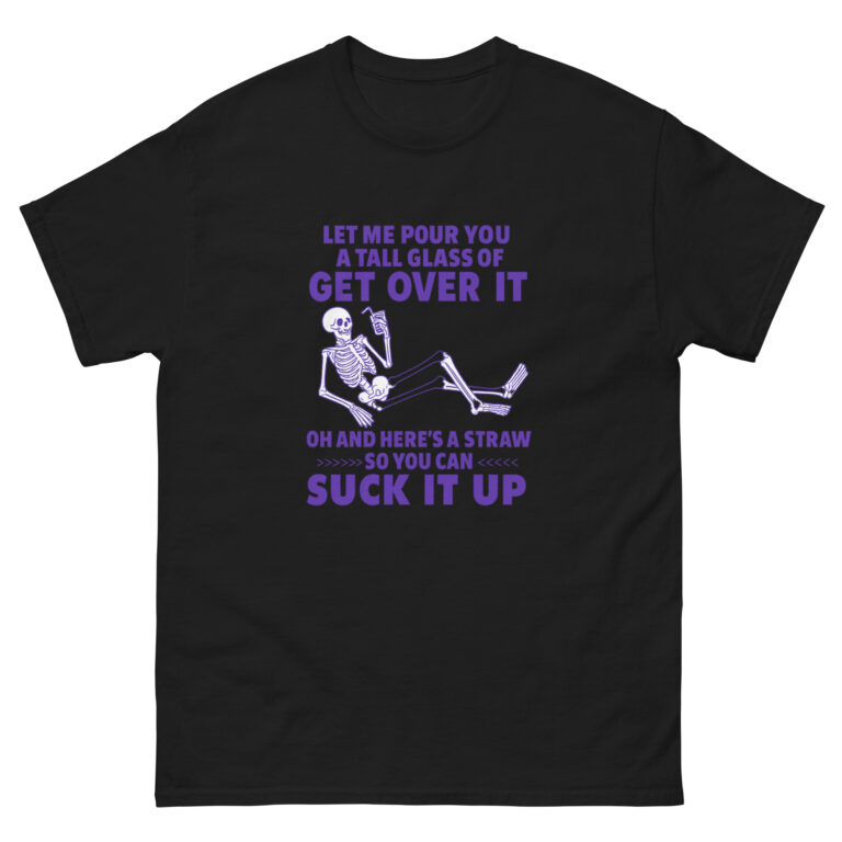 Show your sarcastic side with this funny ‘Get Over It’ skeleton graphic on our unisex Gildan 5000 Classic Tee. Made from 100% cotton for comfort and durability, this premium quality t-shirt is perfect for men and women. The bold purple print features a reclining skeleton with the quotes “LET ME POUR YOU A TALL GLASS OF GET OVER IT” and “OH AND HERE’S A STRAW SO YOU CAN SUCK IT UP,” making it a great conversation starter and gift for anyone who loves witty humor.